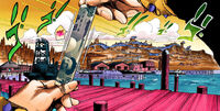 Norisuke continues to feign confusion when pressed with more questions from Damo, but is tortured further as Damo has a fish flop about in Norisuke's liquefied body. It isn't until Damo threatens to murder the entire Higashikata family with Hato being killed in front of him that Norisuke cracks and confesses what he knows about Josuke's connection to Josefumi Kujo. Josuke then confronts Damo, demanding that he free the Higashikatas. Once a tearful Hato also approaches Damo, he melts her and rushes Josuke with Vitamin C. Soft & Wet is revealed to have planted bubbles on Hato, allowing her to escape from Vitamin C's liquid prison. Damo renders Josuke's body into a puddle using Vitamin C; preparing to kill him until he is attacked from behind by multiple spikes. Hato reveals herself as a Stand user and proceeds to viciously impale Damo using multiple spikes fired from her body, all while crying over Damo's betrayal. Damo, now terrified by his girlfriend's unknown powers, attempts to bargain for his life, insisting he was just joking and still loved Hato as she climbs a wall using her Stand to confront him.